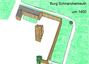 Um das Jahr 1300 wurde die Anlage zum “befestigten Sitz”, einem sogenannten “Vorwerk” der Burg Brandstein. Aus dieser Zeit stammt der zweite (auf der Skizze unten der hintere) Turm. Eine Familie Bayer saß auf der Anlage. 1318 wechselte der Besitzer, Jan von Dobeneck übernahm die Anlage. 1356 ging sie dann in den Besitz der Herren von Reitzenstein über. Aus dem Jahre 1390 stammt die älteste bekannte Urkunde, in der Schnarchenreuth erwähnt wird.